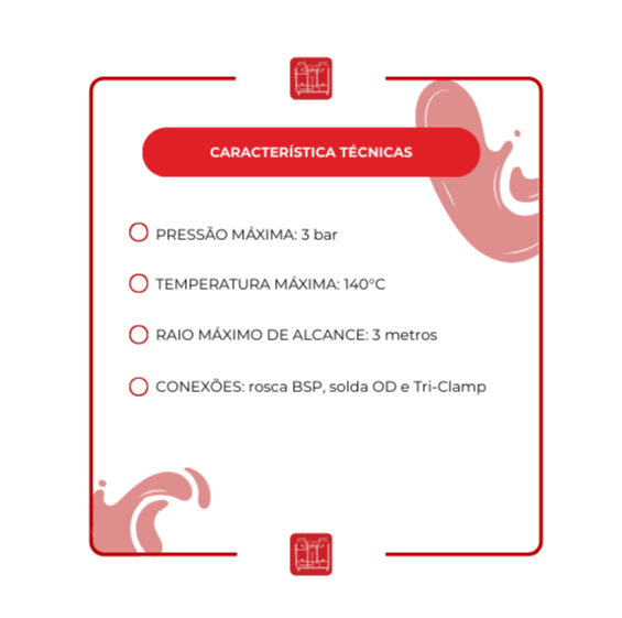 Indicado para processos de limpeza interna de tanques, reservatórios, dutos e misturadores em indústrias alimentícias, farmacêuticas e cosméticas. Ideal para aplicações CIP com baixa pressão e fluido de limpeza recirculado.